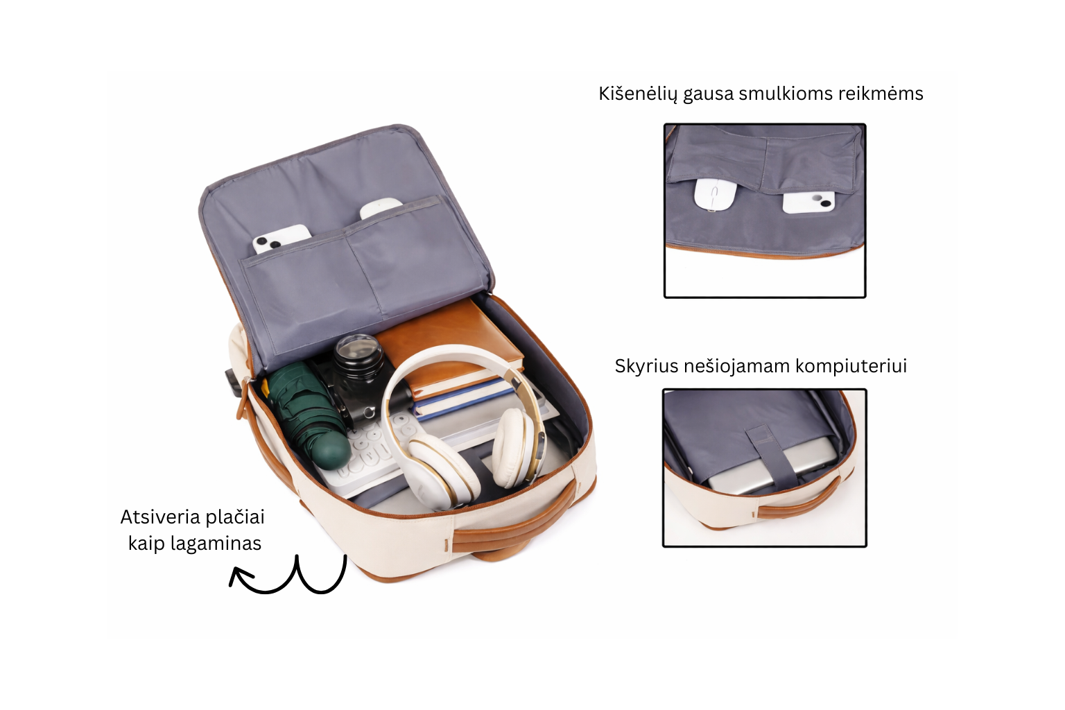 ✔ Neperšlampamas skyrius elektronikai – be baimės laikykite svarbius daiktus (nešiojamą kompiuterį, plašetinį kompiuterį ir kt.) net ir lietingų orų metu.