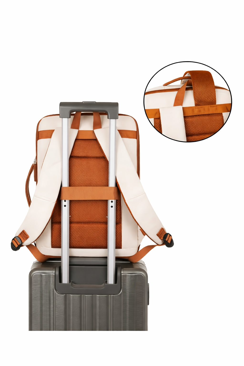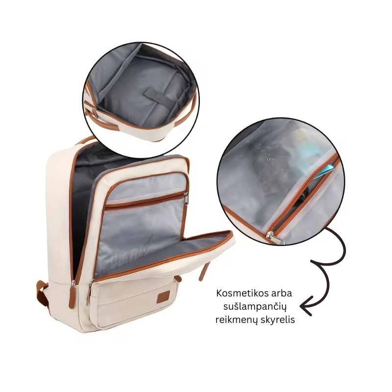 Elegantiška kreminės spalvos ir rudos eko odos detalių kombinacijos kelioninė kuprinė yra puikus pasirinkimas tiek savaitgalio išvykoms, tiek ilgesnėms kelionėms. Itin talpi ir funkcionali – atitinka rankinio bagažo reikalavimus ir leidžia patogiai susidėti visus būtiniausius daiktus. Pagrindinis skyrius atsidaro plačiai kaip lagaminas, todėl daiktus lengva sudėti ir greitai pasiekti. Paminkštintos petnešos ir ergonomiška nugaros dalis užtikrina maksimalų komfortą keliaujant. Praplėtimo funkcija gale leidžia dar labiau išdidinti kuprinės talpą. Stilingas, universalus dizainas puikiai derės prie bet kokios aprangos, todėl ši kuprinė taps nepakeičiama jūsų kelionių kompanione!